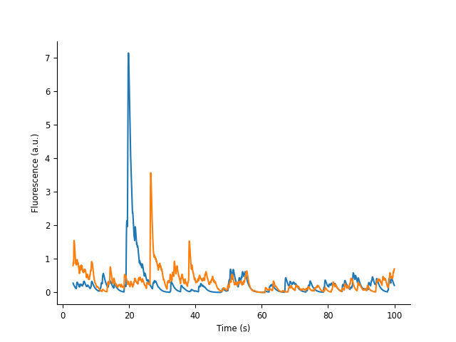 To get an idea of the data, let’s visualize the calcium transients of the first two neurons for the first 100 seconds of the recording.