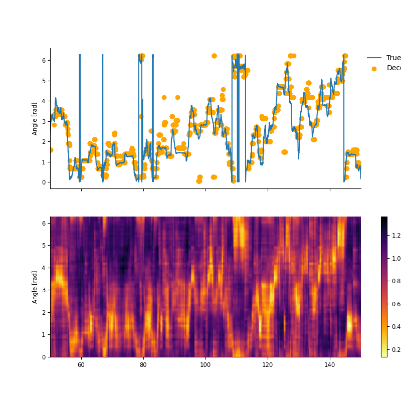 We will us the epoch epochs = nap.IntervalSet([50, 150]) to restrict the decoding to the first 100 seconds of the recording.