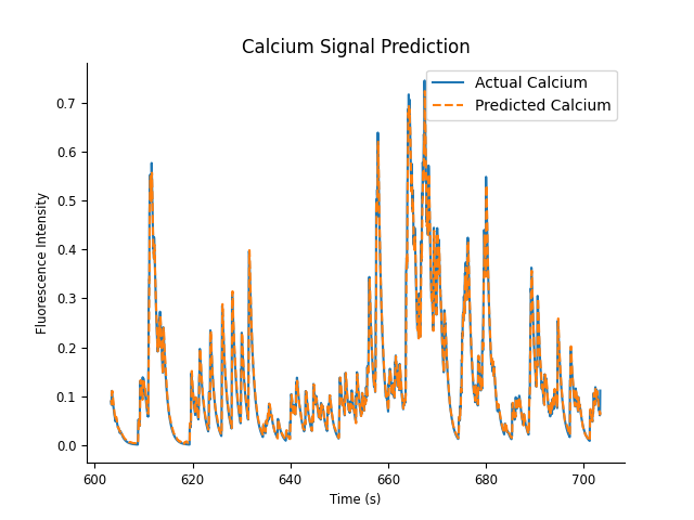 We can visualize the predicted calcium signals alongside the actual signals to assess the model’s performance.