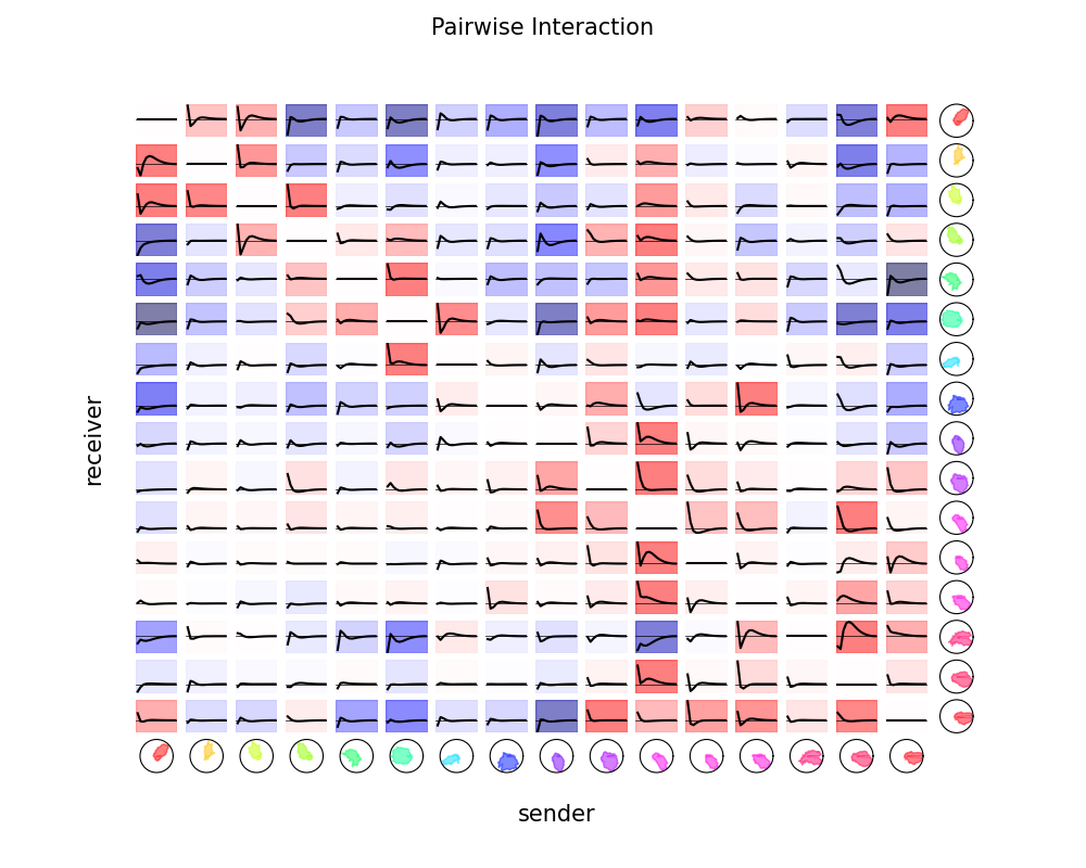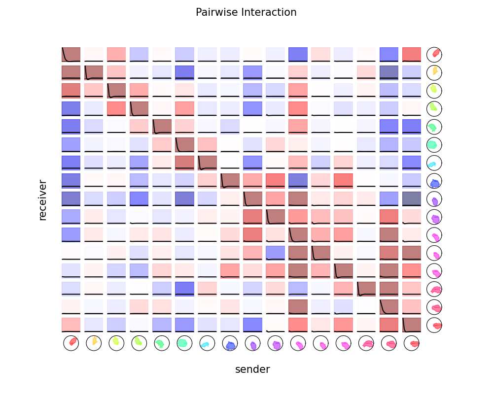 These coupling filters represent the functional relationships between neurons based on their calcium signal. We can see that the self-coupling dominates the coupling filters, which is expected due to the slow dynamics of calcium signals.